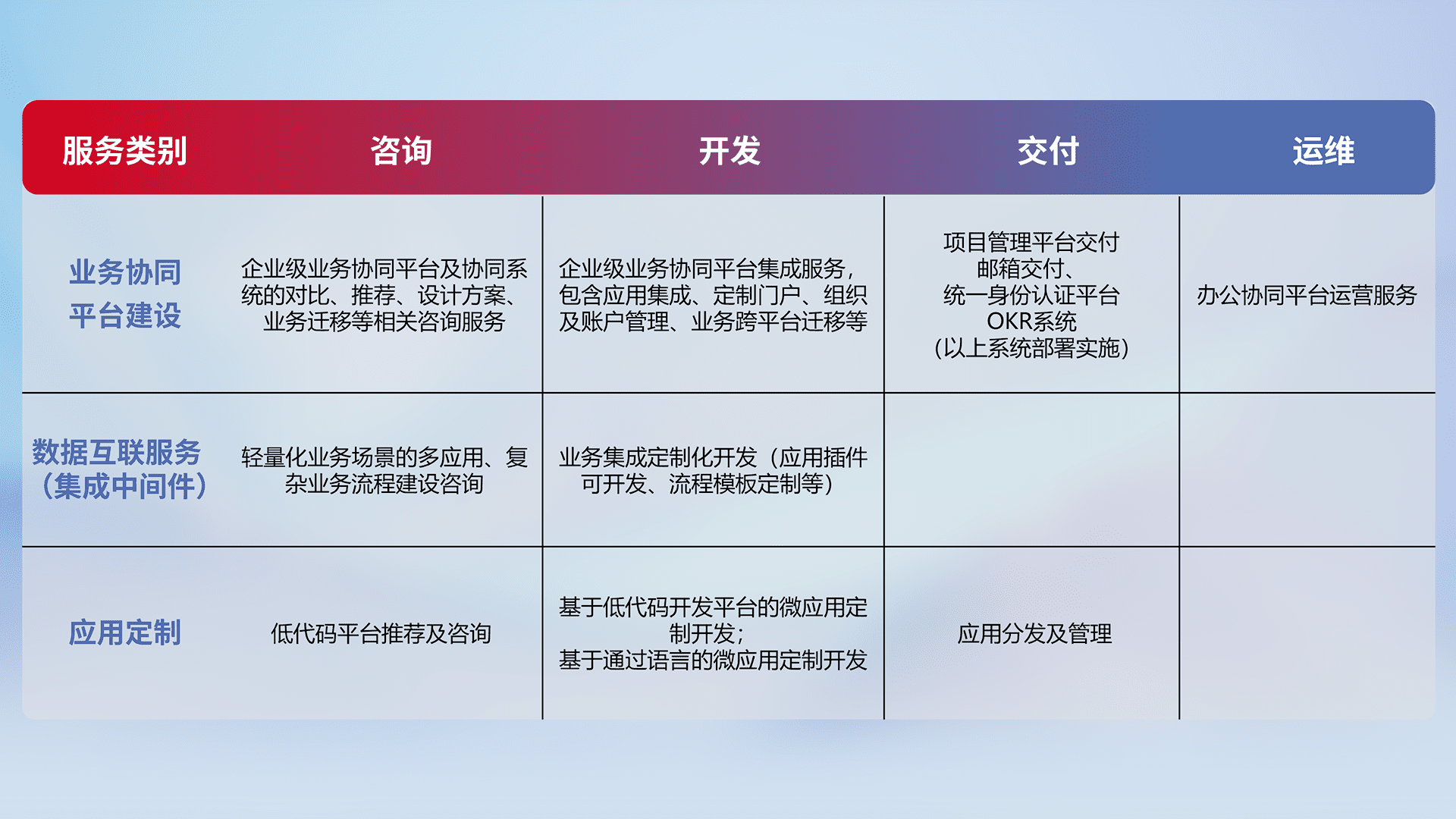 针对钉钉、、、、企微、、IDaas等平台级产品提供产品的规划、、方案、、、交付、、、定制化开发等服务,,,实现如统一协同办公、、、智能客户服务、、、混合会议管理、、智能数据查询、、、、等业务场景,,实现数字化转型。。。。