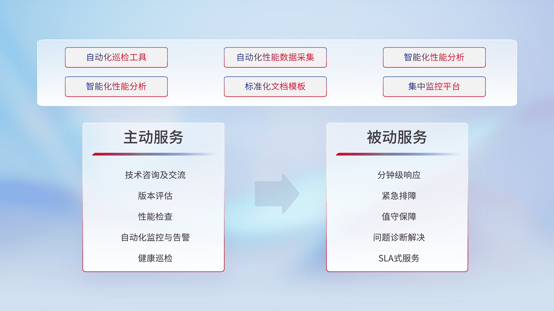 智能化工具和标准化文档,,保障服务质量,,,,提供主动服务(包含技术咨询、、版本评估、、性能检查、、自动化监控与告警、、、健康巡检)和被动服务包含(分钟级响应、、、紧急排障、、、值守保障、、、问题诊断解决、、、、SLA服务)。。