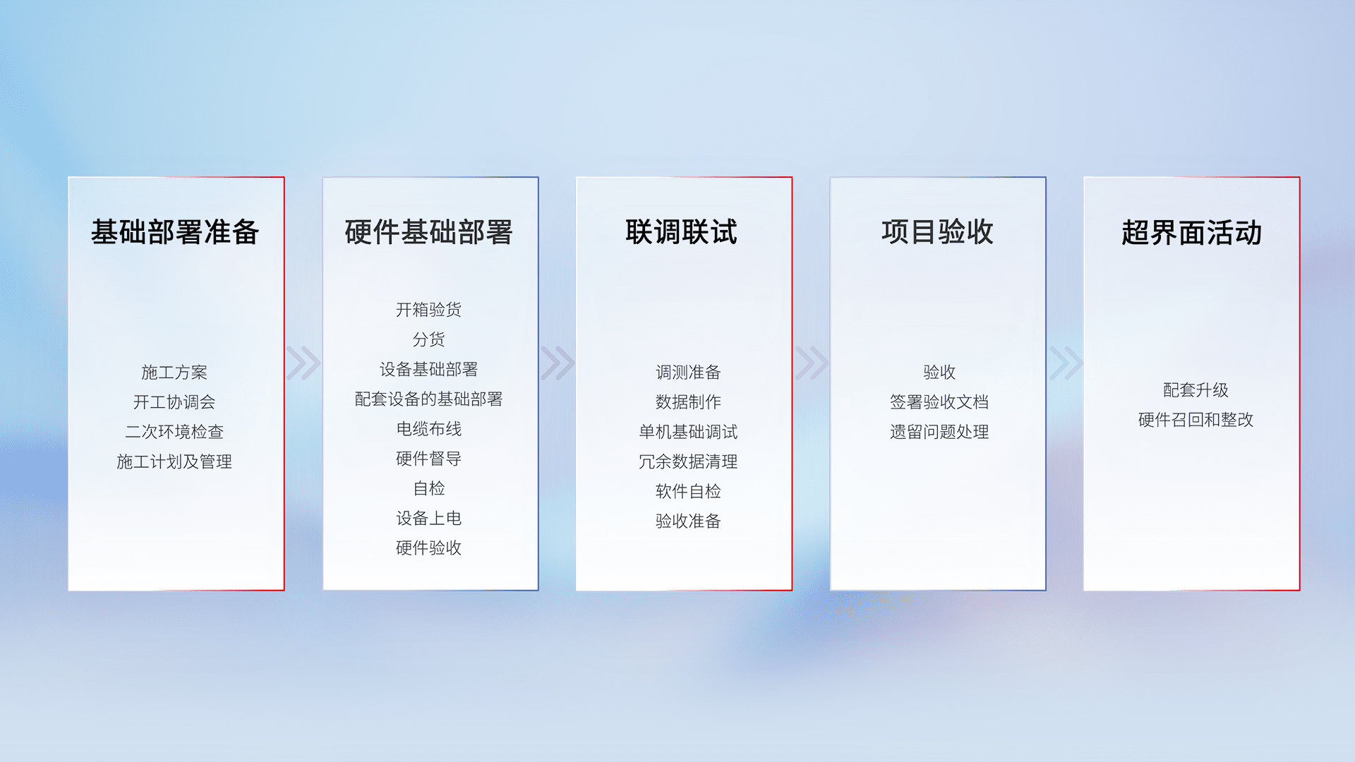从基础部署准备、、、硬件基础部署、、联调联试、、、、项目验收、、、、越界面活动的全过程可追溯,,,,保证施工质量和进度。。